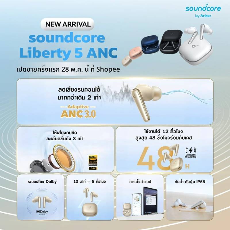 Soundcore Liberty 5 ANC มีให้เลือกถึง 5 เฉดสีสุดพรีเมียม ได้แก่ สีดำ สีขาว สีน้ำเงิน สีแอปริคอต และสีแชมเปญโกลด์ วางจำหน่ายแล้ววันนี้ที่ Soundcore.com, Shopee และร้านค้าที่ร่วมรายการทั่วประเทศ ในราคา 2,999 บาท