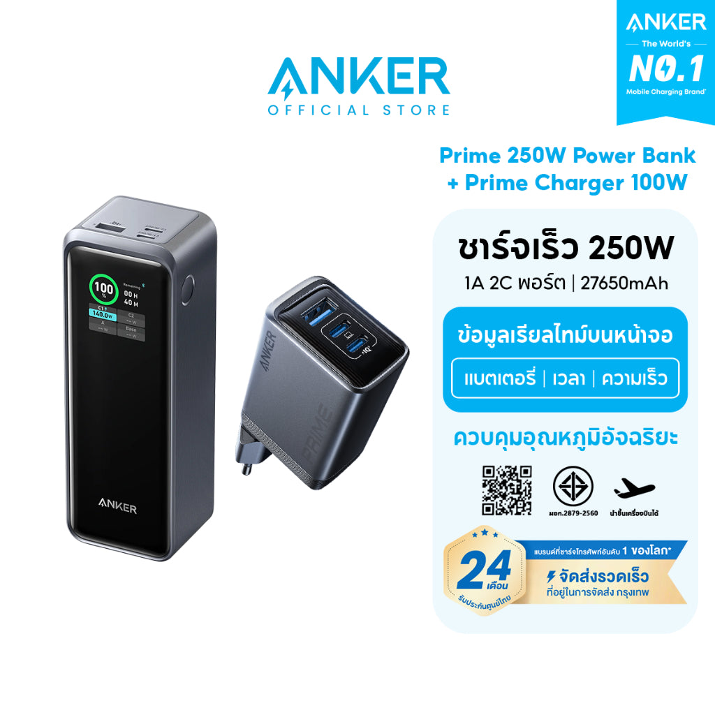 Anker Prime 27650mAh Power Bank ชาร์จเร็ว 250W หลากหลายความต้องการและการใช้งาน ตอบสนองความต้องการการชาร์จมากยิ่งขึ้น พาวเวอร์แบงค์พกพาความสูงพิเศษพร้อมการชาร์จที่รวดเร็ว กำลังเอาต์พุตสูงสุด 250W พอร์ตเดียวเอาต์พุตสูงสุด 140W พอร์ตชาร์จ 3 ช่อง สามารถชาร์จ MacBookPro 2 เครื่องและ iPhone 15 Pro 1 เครื่องพร้อมกัน...