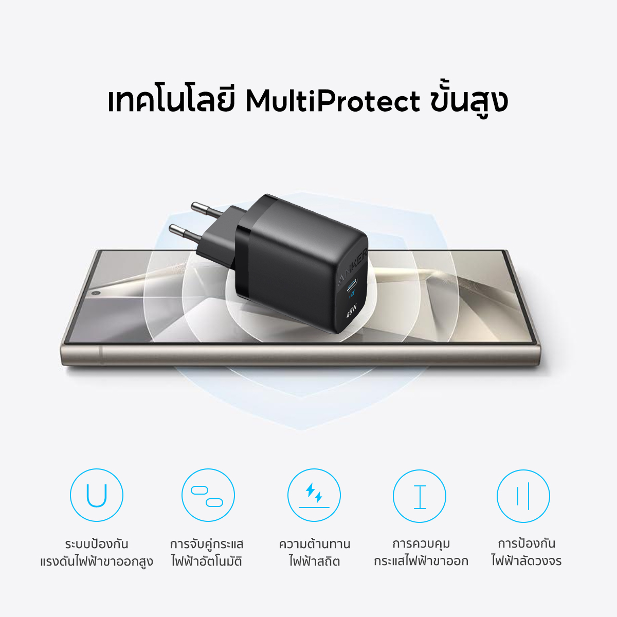ควบคุมอุณหภูมิอัจฉริยะ ปกป้องโทรศัพท์มือถือของคุณตลอดเวลา ประสบการณ์การชาร์จที่ปลอดภัยยิ่งขึ้น มาตรฐานความปลอดภัย IEC 62368-1 ล่าสุด ความปลอดภัยขั้นสูงด้วยการป้องกันหลายด้าน ชาร์จได้อย่างไร้ความกังวล