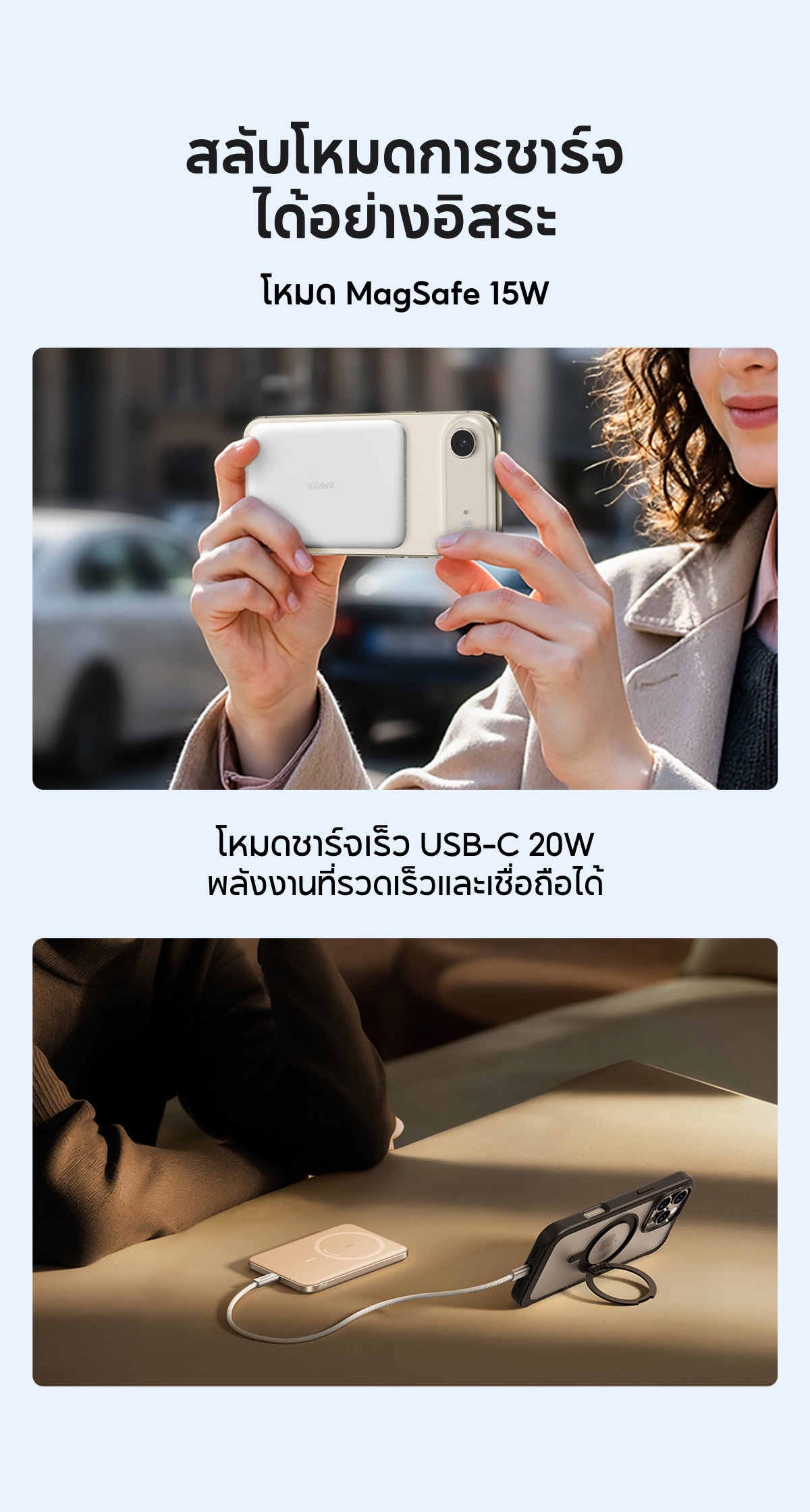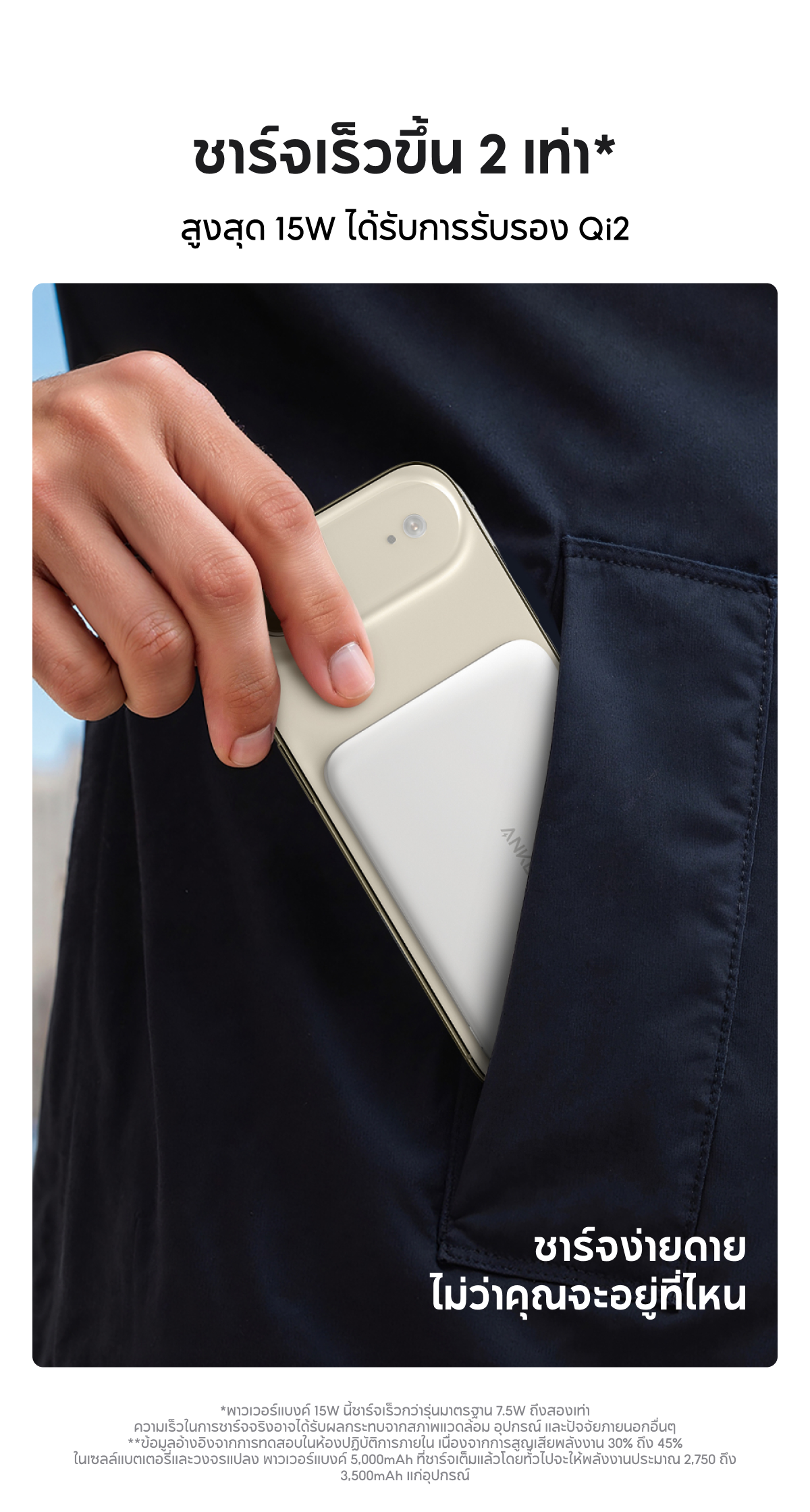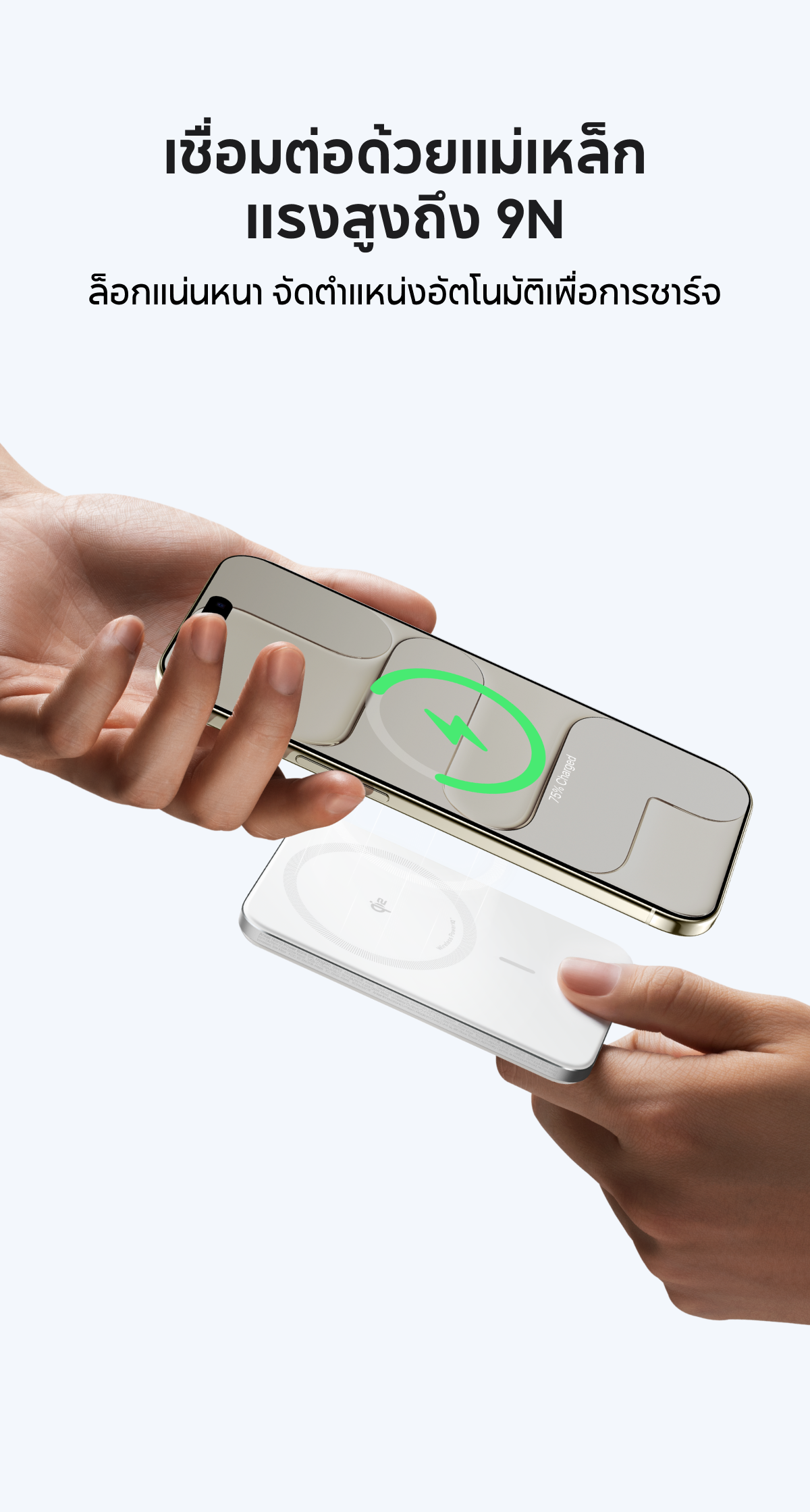 🔹พาวเวอร์แบงค์แม่เหล็กบางเฉียบ รองรับ Qi2: สัมผัสความเพรียวบางด้วยพาวเวอร์แบงค์แม่เหล็กบางเฉียบขนาด 0.3 นิ้ว ให้ความจุ 5,000mAh ที่เชื่อถือได้