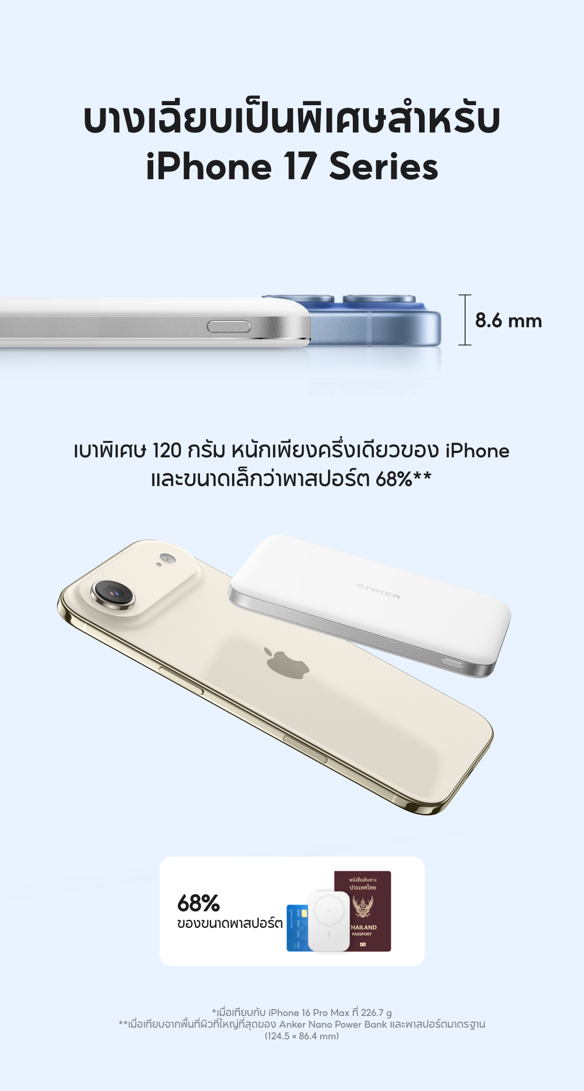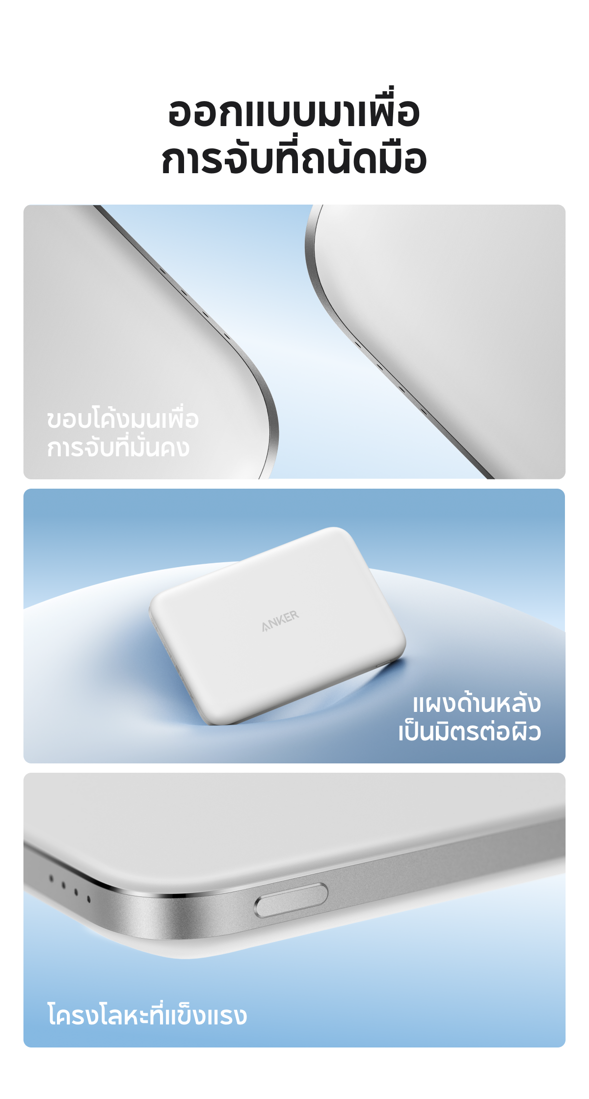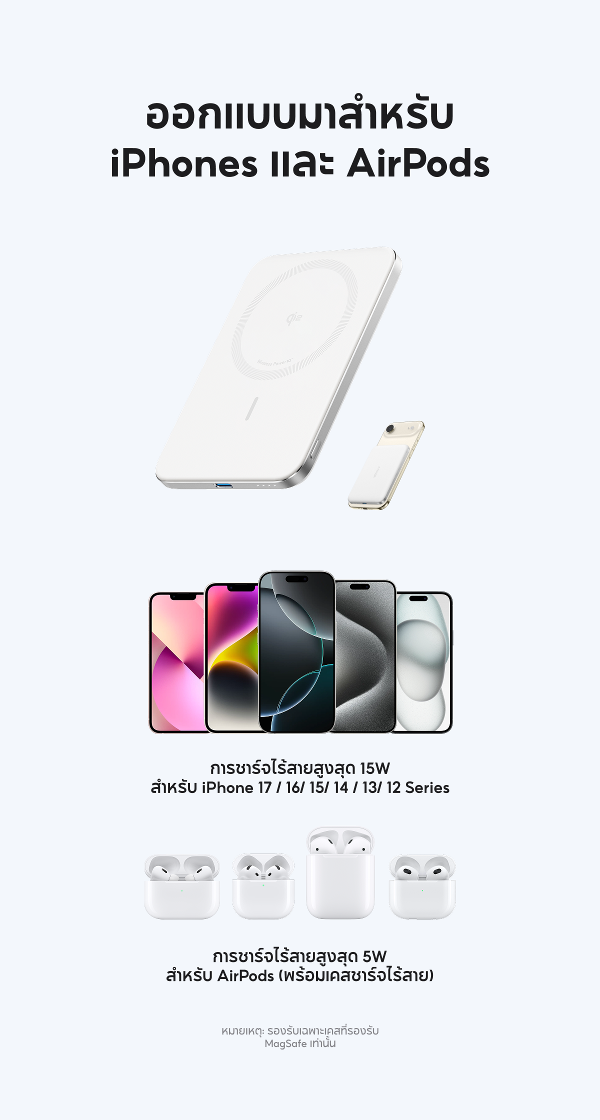 🔹พาวเวอร์แบงค์แม่เหล็กบางเฉียบ รองรับ Qi2: สัมผัสความเพรียวบางด้วยพาวเวอร์แบงค์แม่เหล็กบางเฉียบขนาด 0.3 นิ้ว ให้ความจุ 5,000mAh ที่เชื่อถือได้