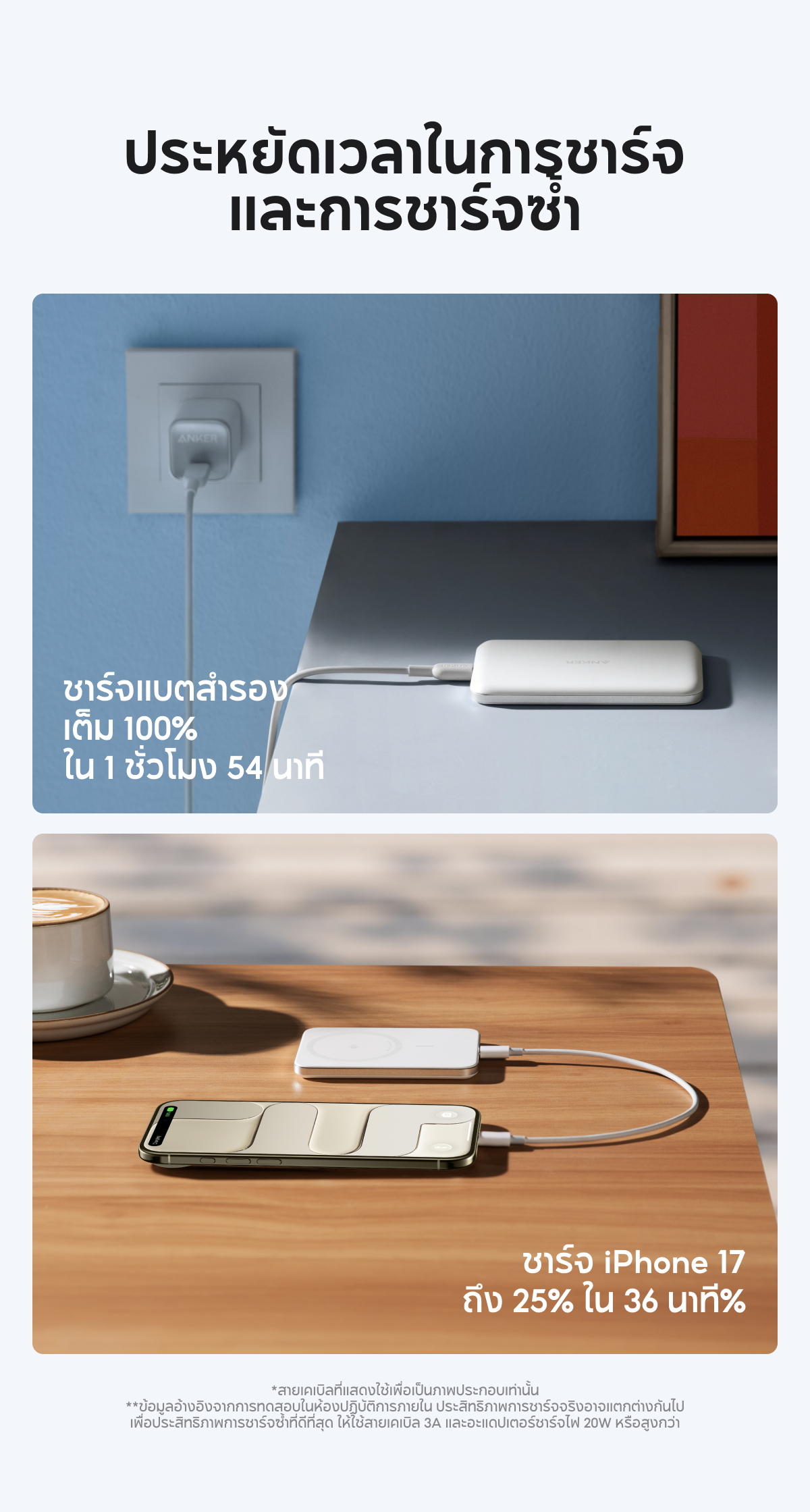 🔹การชาร์จที่รองรับ MagSafe 15 วัตต์: ด้วยการชาร์จเร็วที่รองรับ MagSafe 15 วัตต์สูงสุด Anker Nano Power Bank จึงมอบประสิทธิภาพสูงสำหรับการชาร์จมือถือ ชาร์จ iPhone 16 Pro ได้ถึง 25% อย่างรวดเร็วในเวลาเพียง 42 นาที (ข้อมูลอ้างอิงจากการทดสอบภายในห้องปฏิบัติการ ประสิทธิภาพการชาร์จจริงอาจแตกต่างกันไป)