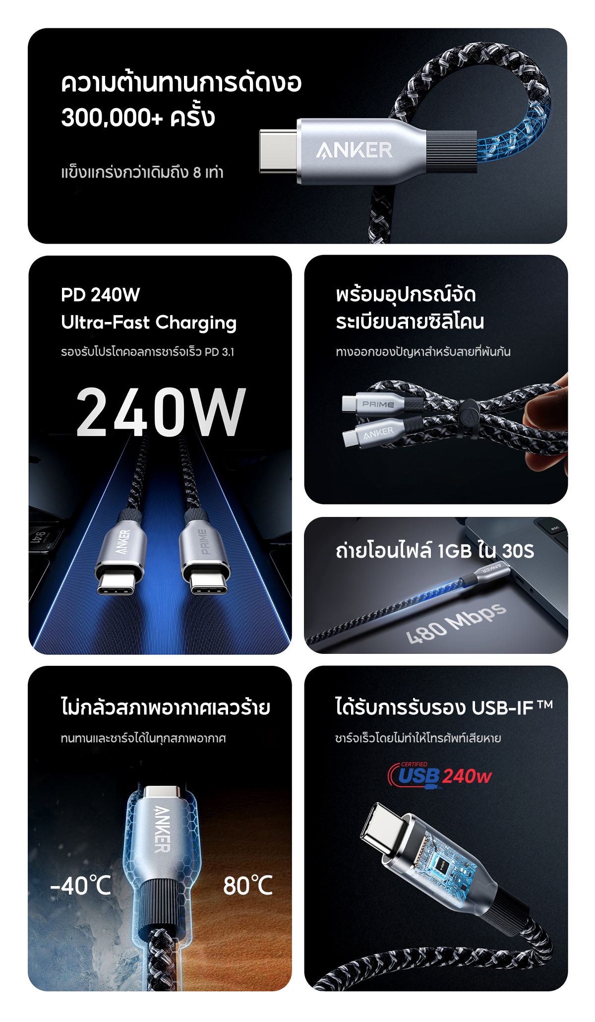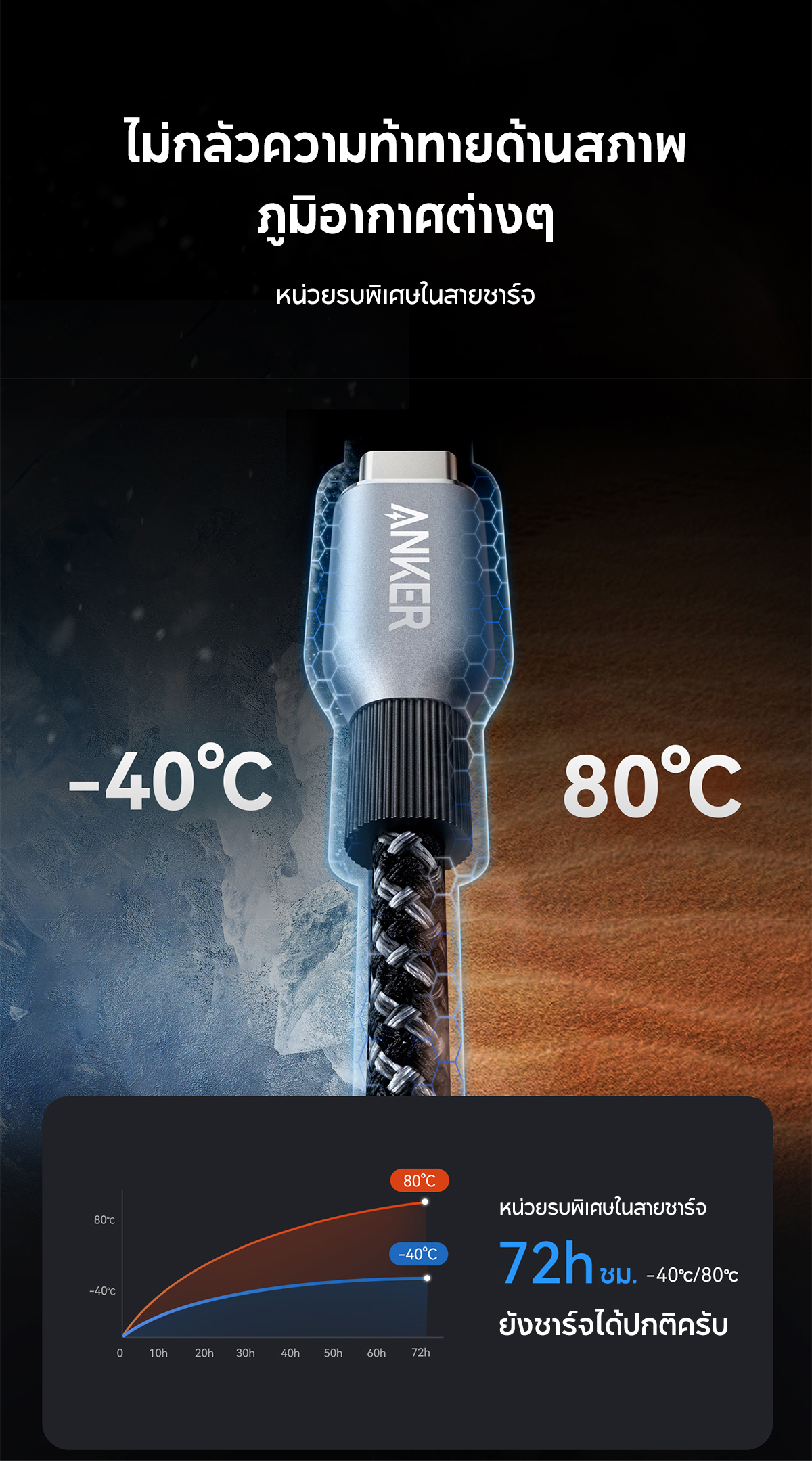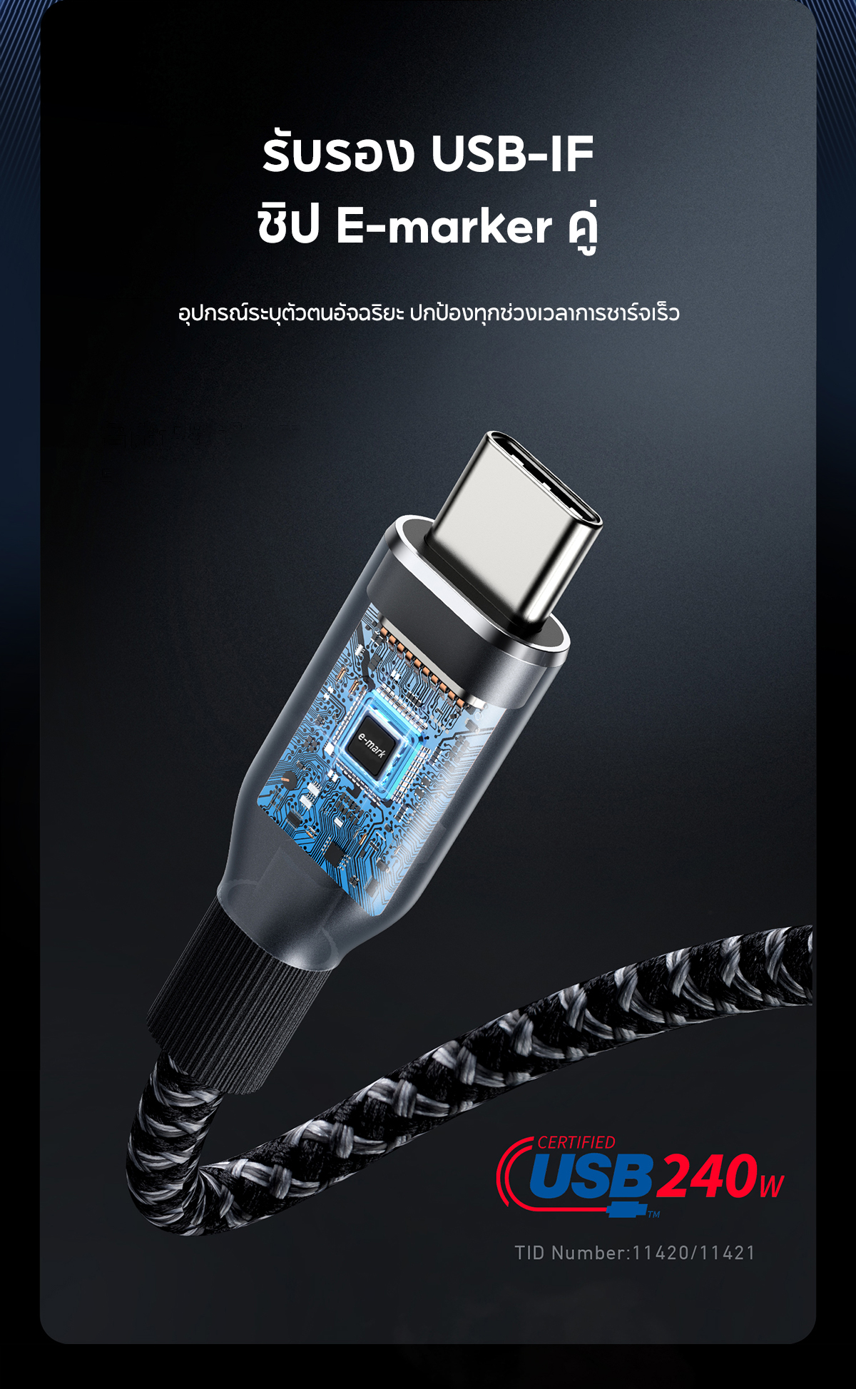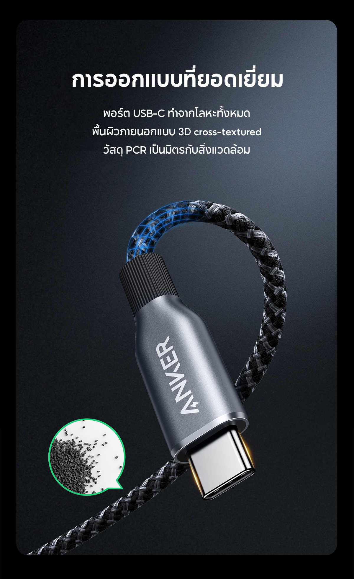 สัมผัสประสบการณ์การชาร์จ 240W ที่รวดเร็วเป็นพิเศษด้วยสายเคเบิลที่ยั่งยืนซึ่งทำจากไนลอนรีไซเคิลหลังการบริโภค ให้การถ่ายโอนข้อมูลที่รวดเร็วและความทนทานในอุณหภูมิที่รุนแรงตั้งแต่ -40°F ถึง 176°F